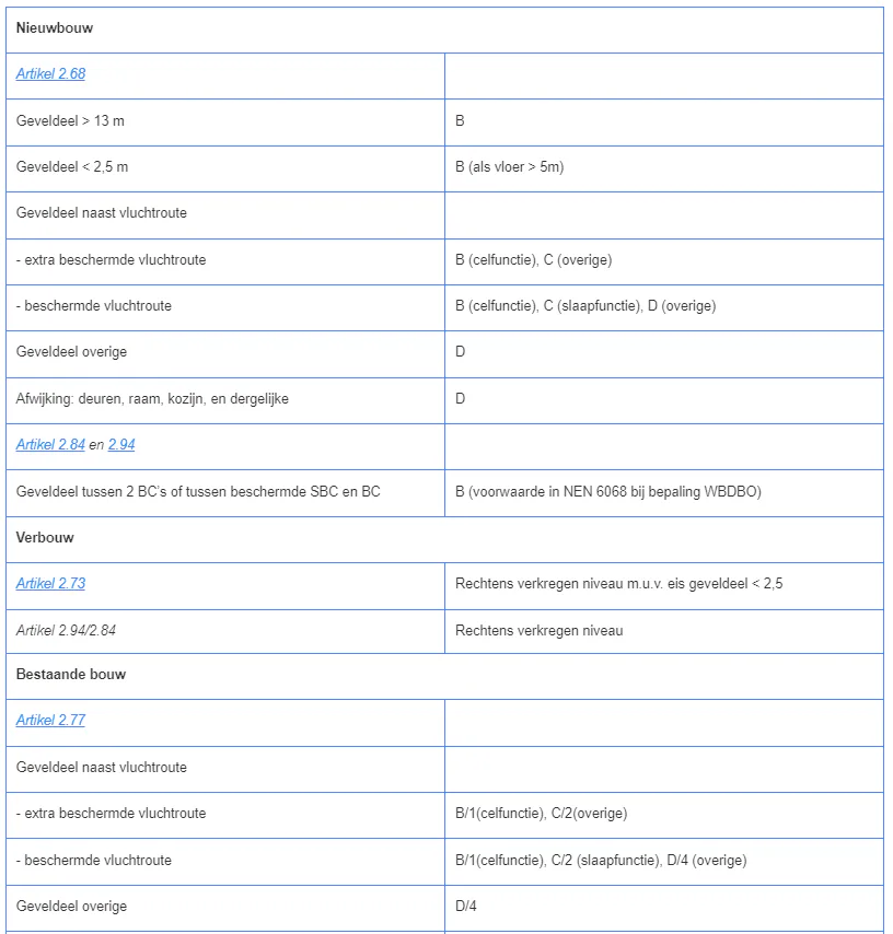 In de bijlage van het protocol staat een samenvatting van de prestatie-eisen die het Bouwbesluit stelt aan gevels. Er gelden eisen voor nieuwbouw, verbouw en bestaande bouw. Uitgaande van de risicovolle gebouwen die worden geïnventariseerd, zal bij die gebouwen altijd sprake zijn boven elkaar gelegen (sub-)brandcompartimenten met gevelopeningen (ramen) waartussen een brandwerendheidseis (‘WBDBO’) geldt. Dit betekent dat brandklasse B altijd van toepassing is (NEN 6068), ook voor het niveau bestaande bouw. Brandklasse B zal daarom bepalend zijn voor het onderzoek. Een uitzondering betreft geveldelen over meerdere verdiepingen zonder ramen. Dit is bijvoorbeeld mogelijk bij een kopgevel van een flatgebouw. Ook doorgaande gevelbekleding bij een trappenhuis kan een uitzondering zijn. De eis die voor deze geveldelen geldt is afhankelijk van het specifieke gebouw en de verleende bouwvergunning, maar zal minimaal brandklasse D zijn.